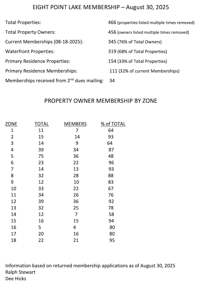 If you are a property owner at Eight Point Lake and a new, renewing or prospective member, we invite you to get better acquainted with the Eight Point Lake Property Owners' Corporation. Meet the many people involved in making and keeping our beautiful lake a special place for all ages to live or vacation. Nearly 80% of property owners are Association members. A Lake Directory is included with your annual membership dues. The application form is available here or on the Forms & Documents page.